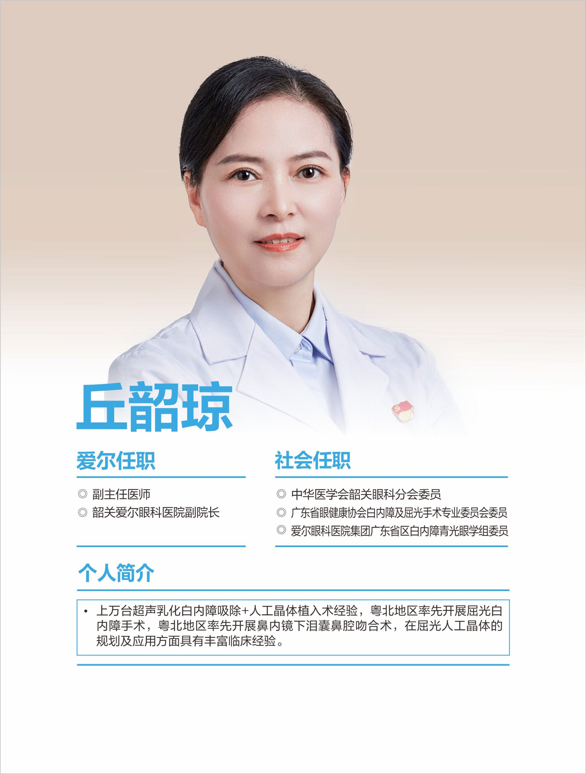 韶關(guān)愛爾眼科醫(yī)院有限公司白內(nèi)障團(tuán)隊擁王愛琴院長(愛爾眼科粵北區(qū))、丘韶瓊院長、郭俊豪主任等多位專科醫(yī)生,具備同步國際的白內(nèi)障手術(shù)能力,能熟練開展各項常規(guī)及疑難白內(nèi)障手術(shù)。 可開展微切口煥晶白內(nèi)障手術(shù),植入多焦晶體或多焦+散光矯正晶體,在治療白內(nèi)障同時同步解決遠(yuǎn)視/近視、老花眼、角膜散光等屈光問題,醫(yī)生手術(shù)經(jīng)驗豐富,為眾多患者帶來更舒適的視覺。